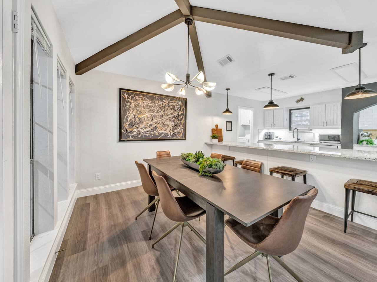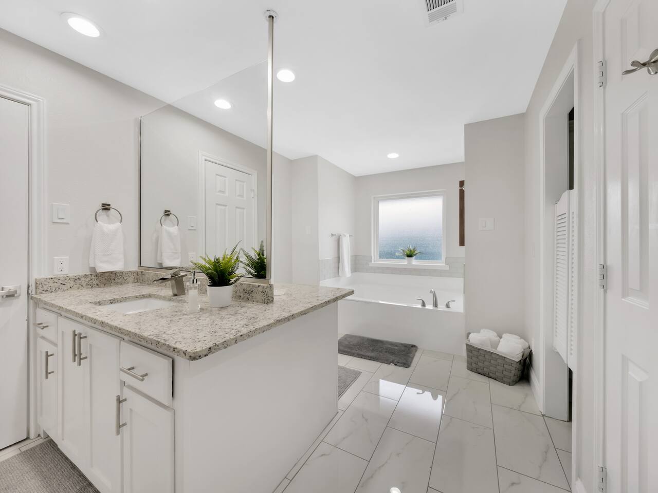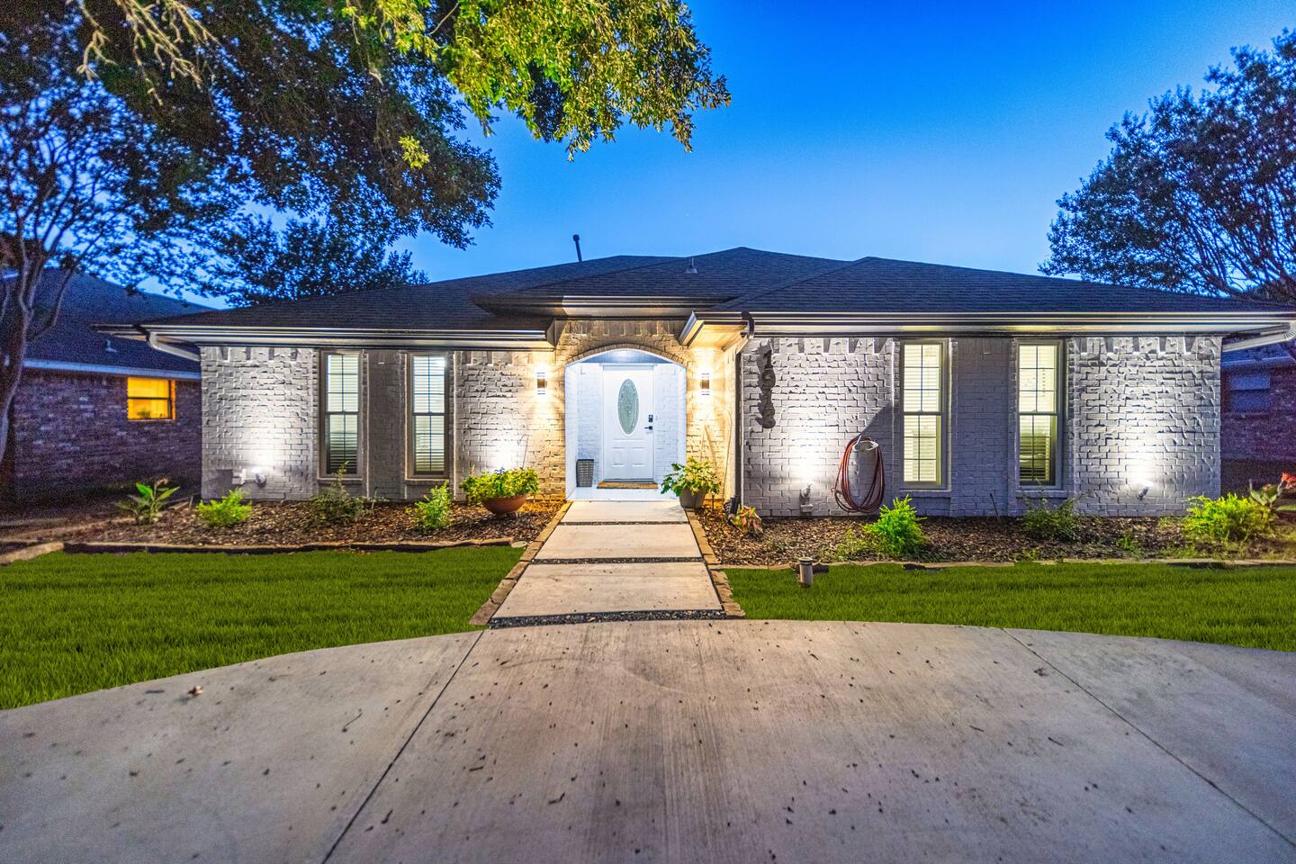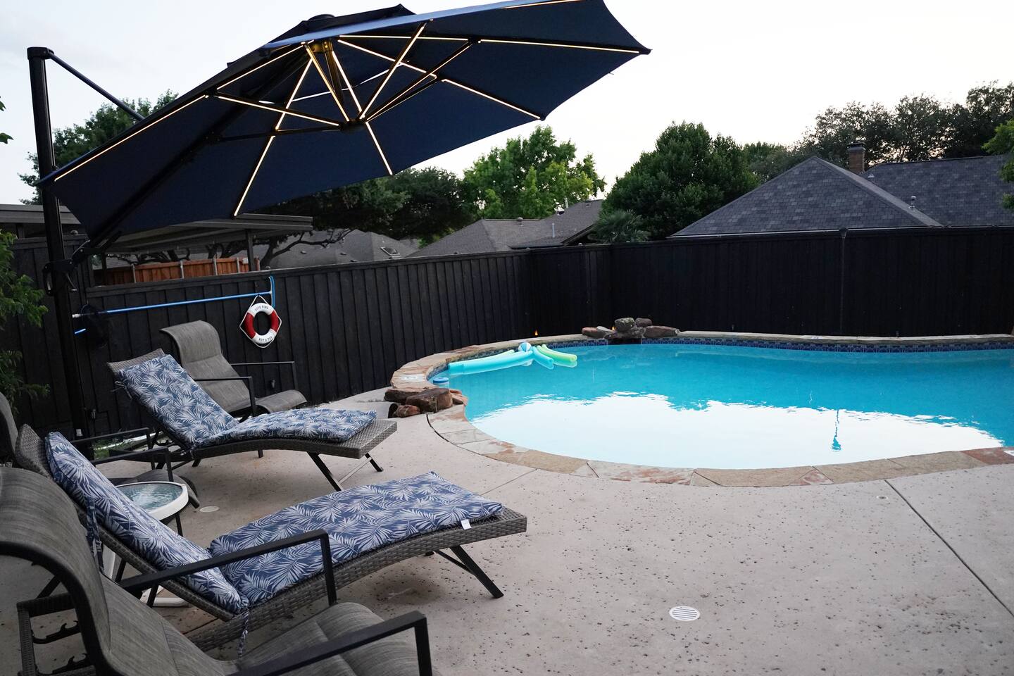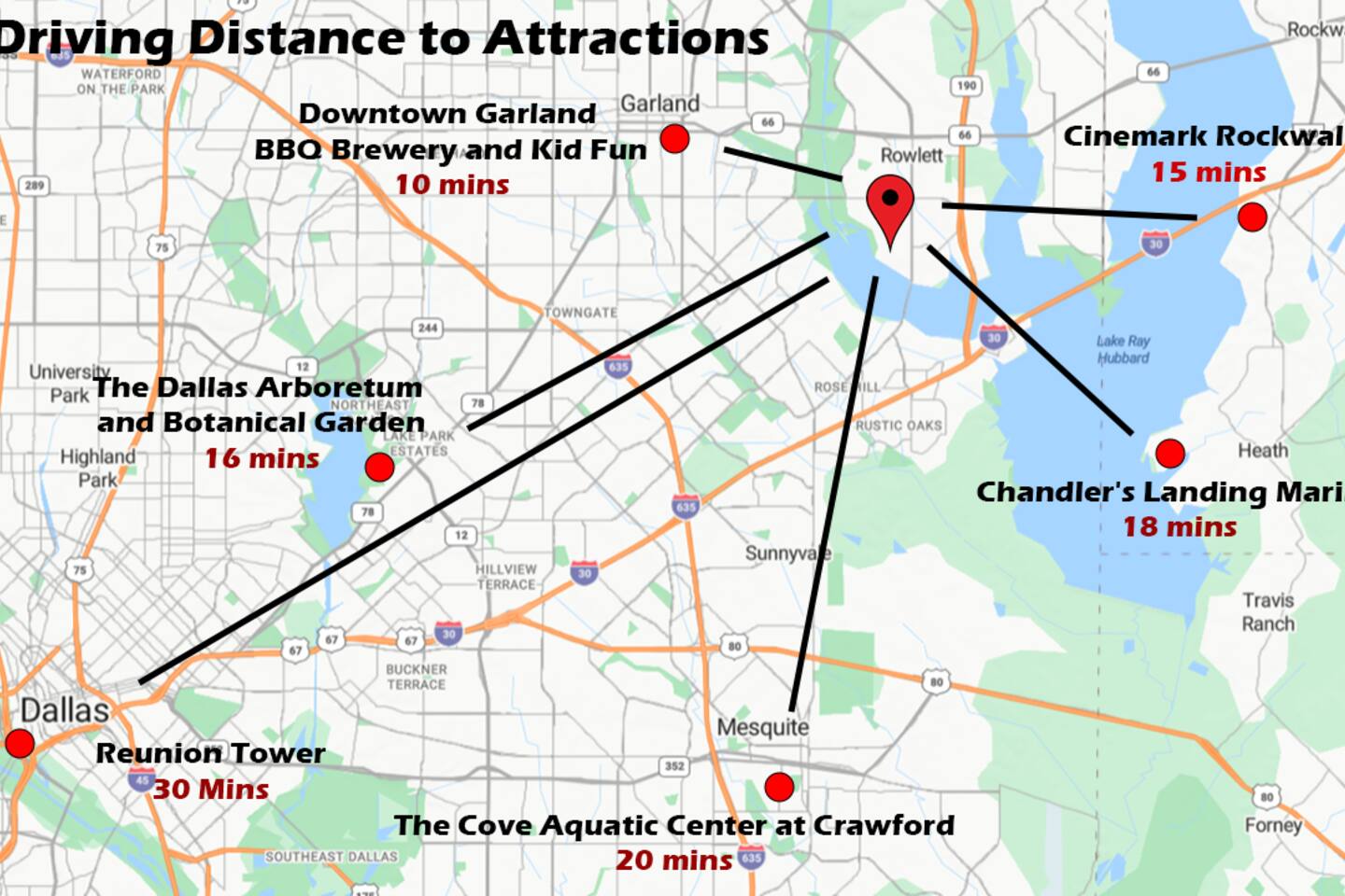 Exclusive speakeasy for unique adult gatherings: features a bar cart, artwork & record player. ★ "Super kid friendly, very clean and spacious! Loved the outdoor oasis with the pool and hot tub!" Other amenities: → Self check-in w/ smartlock → Luggage drop off → Indoor gas fireplace → Dedicated workspace → Onsite washer + dryer → Central AC + heating Family friendly space with high chair, pack n’ play, children’s dinnerware, playroom, books & toys. Pet friendly home with pet supplies like dog bowl & bed provided. SLEEPING ARRANGEMENTS: —-------------------------------- ♛ Bedroom #1: King bed, 40” smart TV + ensuite w. Jacuzzi ♛ Bedroom #2: Queen bed ♛ Bedroom #3: Full sized bed + 3 single beds ♛ Bedroom #4: Queen trundle bed ♛ Bedroom #5: Queen bed + sofa bed + ensuite Kitchen with breakfast bar, double ovens, blender, bread maker, Keurig & drip coffee maker. ATTRACTIONS: —----------------- ✩ Wet Zone Waterpark (5 mins) ✩ Paddle Point Park (6 mins) ✩ Kids Kingdom at Pecan Grove Park (5 mins) ✩ Rowlett Bowlarama (7 mins) ✩ Retrocade (7 mins) Just 5 minutes to stunning Lake Ray Hubbard—perfect for boating, fishing & scenic walks. ★ "The property is beautiful, and the quiet, peaceful atmosphere was a real highlight." Add my listing to your wishlist by clicking the ❤ in the upper-right corner. Book your luxurious stay in Rowlett now!
